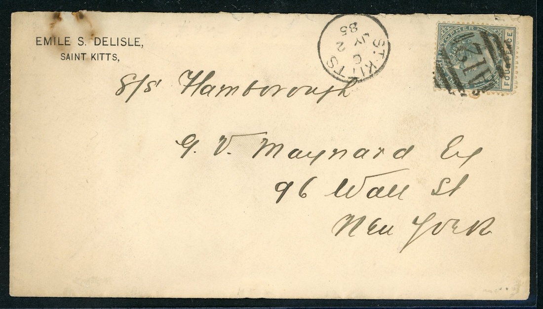 1885 (2 July) envelope to New York, bearing 4d. grey tied by "A12" obliterator with St. Kitts c.d.s. alongside and showing arrival datestamp (9.7) on reverse