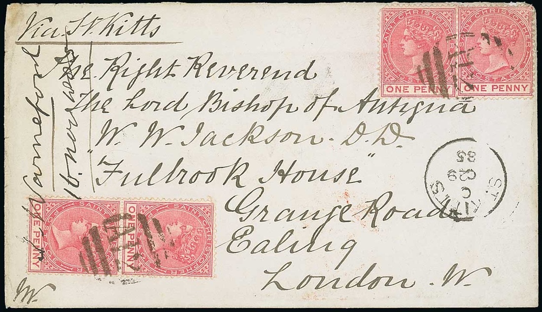 1885 (29 Oct.) envelope to London, bearing 1d. rose-carmine (4) tied by "A12" obliterator, showing St. Kitts c.d.s. with part arrival datestamp on reverse. An unusual make-up of the rate. Photo