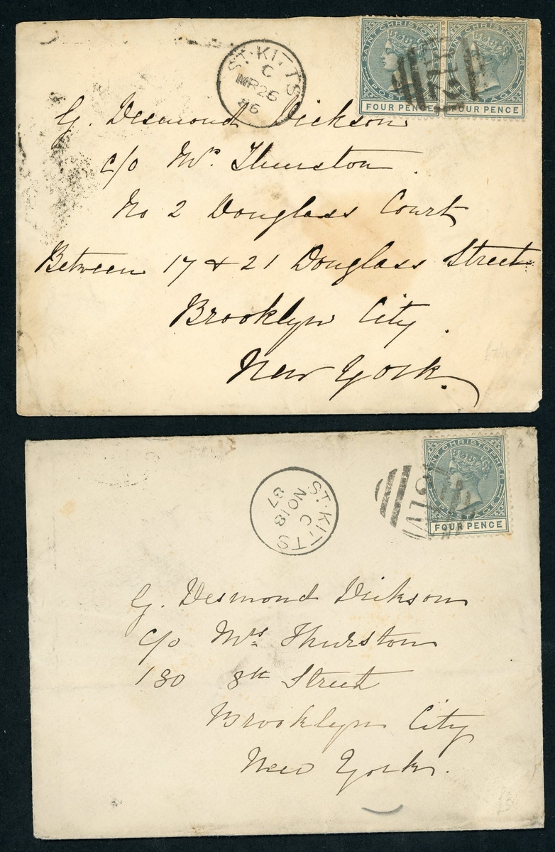 1886 (Mar) - 1887 (Dec.) envelopes (5) to New York, each bearing 4d. grey paying the single (3) or double (2) rate, all cancelled by "A12" obliterator and showing St. Kitts c.d.s., all with faults