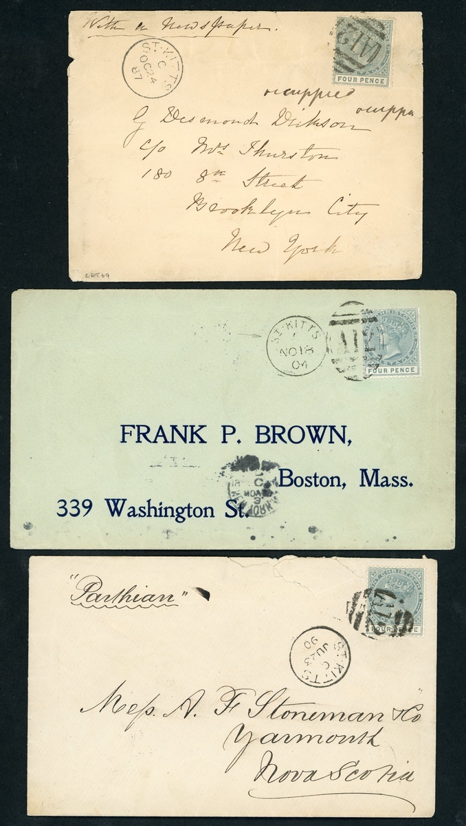 1887 (24 Oct.) envelope to New York and 1890 (23 June) envelope to Nova Scotia, both bearing 4d. grey tied by "A12" obliterator and showing St. Kitts c.d.s., and both envelopes with some faults; also 1904 (18 Nov.) envelope to Boston, bearing 4d. grey tied by St. Kitts "A12" duplex