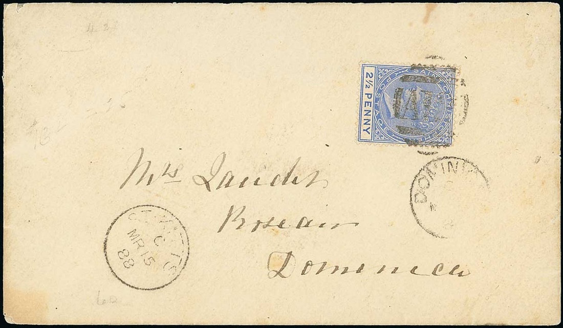 1888 (15 Mar.) envelope to Dominica, bearing 2½d. ultramarine tied by "A12" obliterator and showing St. Kitts and arrival datestamps. The only recorded example of this franking. Photo