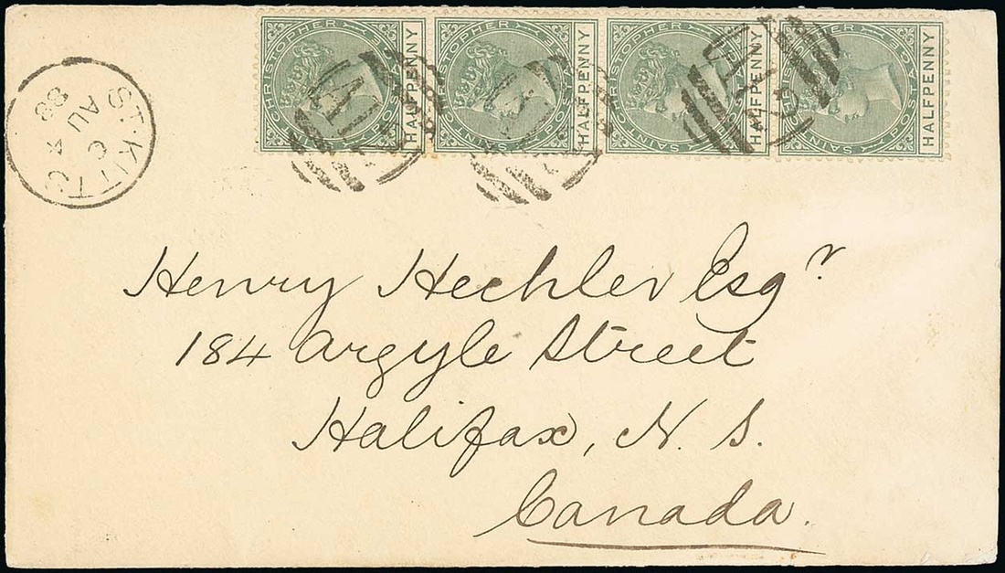 1888 (4 Aug.) envelope to Halifax, Nova Scotia, bearing ½d. dull green vertical strips of four (2, one on reverse), both tied by "A12" obliterator, showing St. Kitts c.d.s. with arrival datestamp (18.8) on reverse. A rare make-up of the rate. Photo