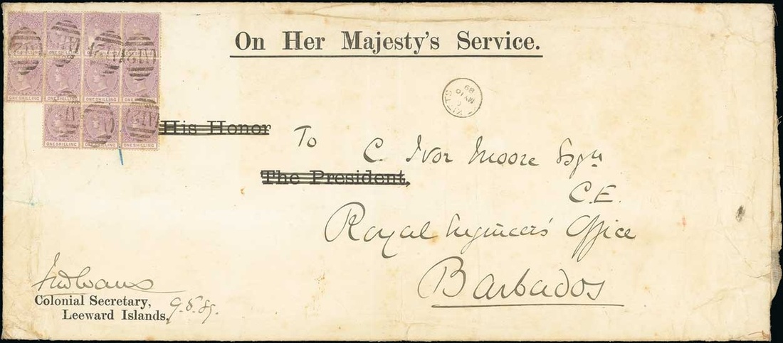 1889 (9 May) large OHMS envelope (410x178mm.) from the Colonial Secretary, Leeward Islands to the Royal Engineer's Office, Barbados, bearing 1/- mauve block of nine and a vertical pair, all cancelled by "A12" obliterator, showing St. Kitts c.d.s. with arrival datestamp (13.5) on reverse; a few small faults as to be expected with an item of this size. A truly remarkable franking. Photo