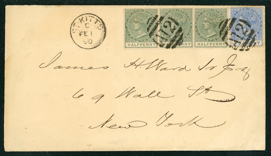 1890 (1 Feb.) envelope to New York, bearing ½d. dull green strip of three and 2½d. ultramarine, both cancelled by "A12" obliterator and showing St. Kitts c.d.s. alongside with arrival datestamp on reverse. A neat and attractive franking