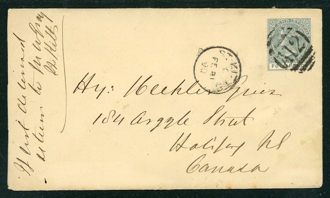 1890 (21 Feb.) envelope to Canada, bearing 4d. grey tied by "A12" obliterator and showing St. Kitts c.d.s. alongside with Halifax arrival datestamp (4.3) on reverse