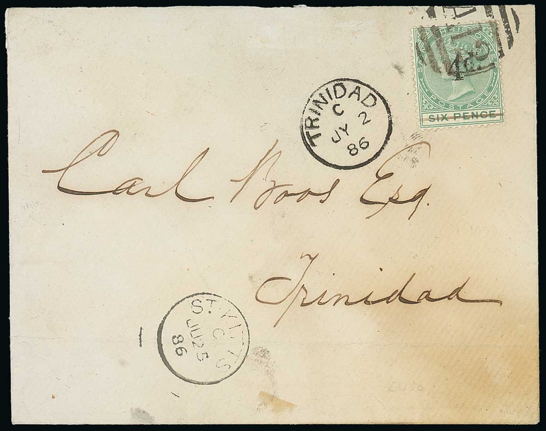 1886 (25 June) envelope to Trinidad, bearing 4d. on 6d. (lifted and hinged in place), clearly tied by "A12" obliterator and showing St. Kitts and arrival (2.7) datestamps; the envelope with flap missing and some light discolouration towards lower right corner. Photo