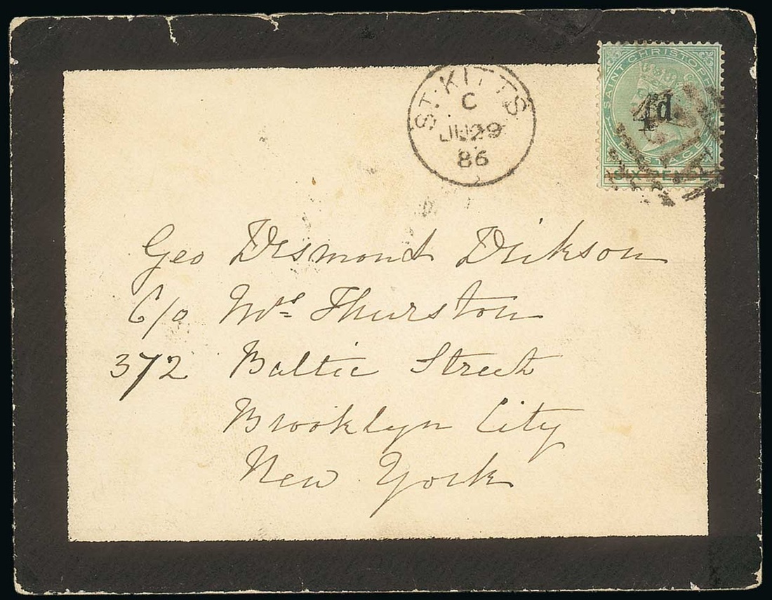 1886 (29 June) mourning envelope to New York, bearing 4d. on 6d. tied by "A12" obliterator with St. Kitts c.d.s. alongside and arrival datestamp on reverse. A scarce commercial usage. Photo