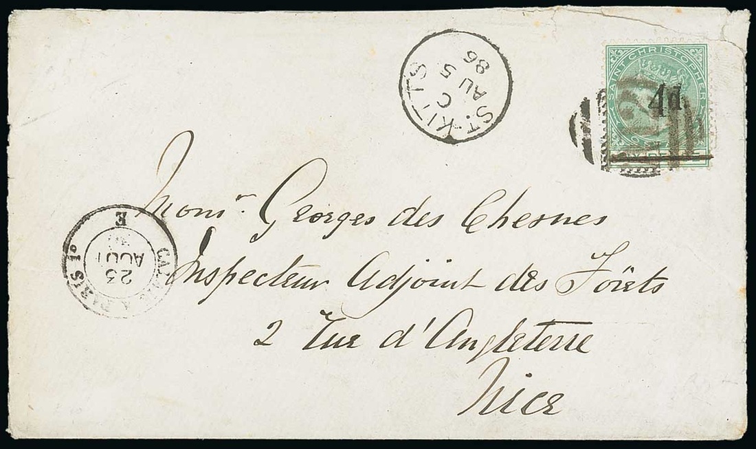 1886 (5 Aug.) envelope to France, bearing 4d. on 6d. green tied by "A12" obliterator, showing St. Kitts c.d.s. and Calais to Paris T.P.O. d.s. with arrival datestamp (24.8) on reverse. A fine commercial usage to an unusual destination. Photo