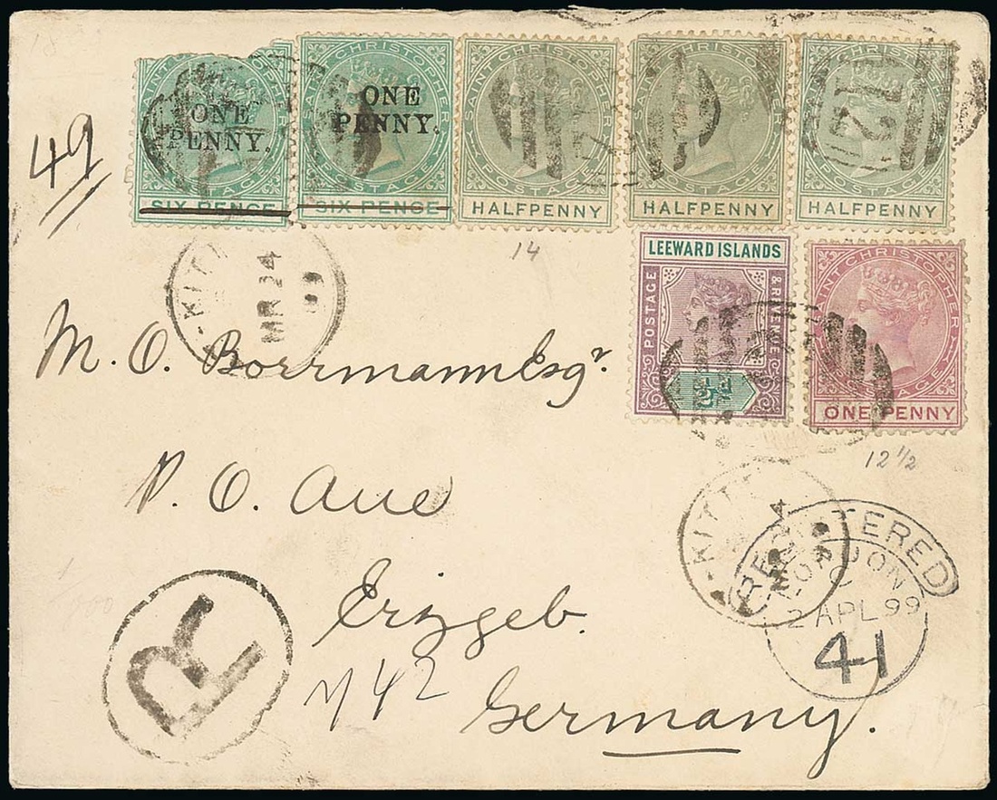1899 (24 Mar.) envelope registered to Germany, bearing 1d. on 6d. (2, one defective) in combination with 1882 ½d. dull green, 1d. dull magenta and Leeward Islands 1890 ½d., all cancelled by "A12" obliterator, showing