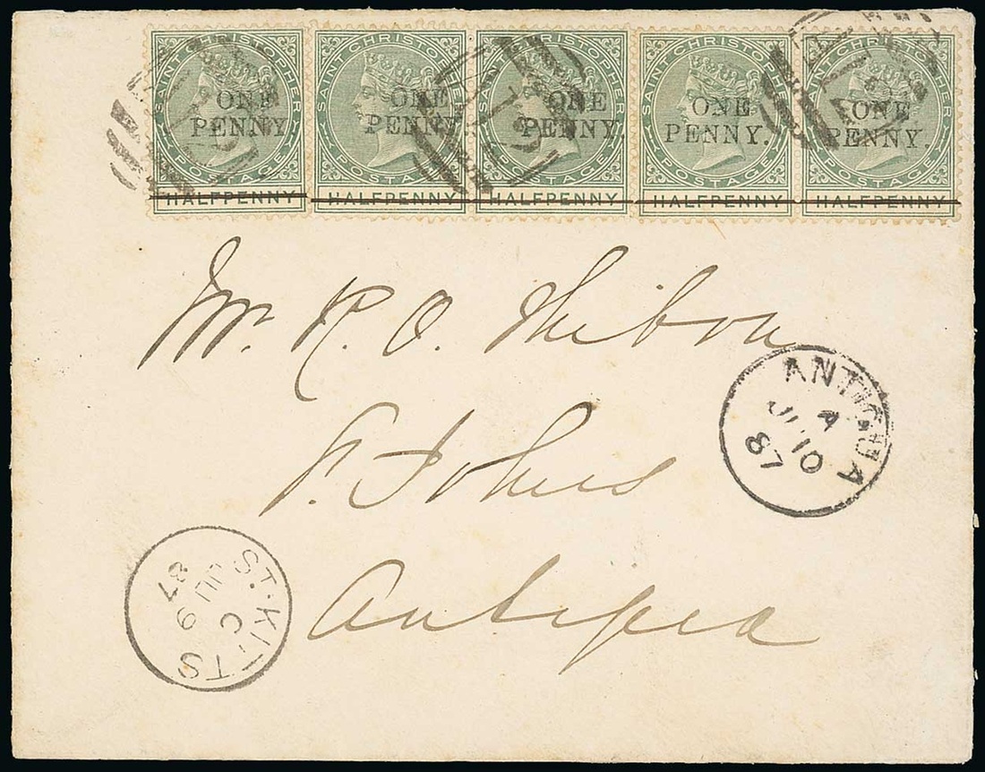 1887 (9 June) envelope to Antigua, bearing a strip of four and a single tied by "A12" obliterator, and showing St. Kitts and arrival (10.6) datestamps, fine. Photo