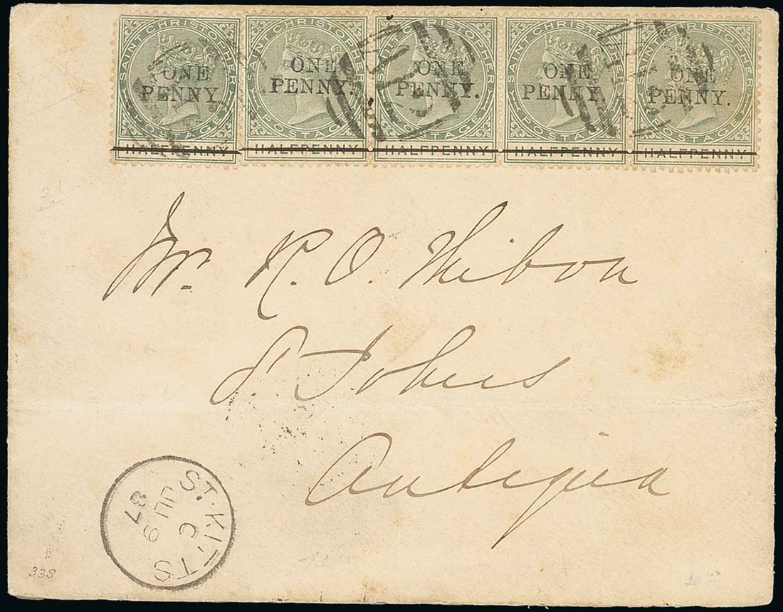 1887 (9 June) envelope to Antigua, bearing a strip of four and a single tied by "A12" obliterator, and showing St. Kitts c.d.s. with arrival (10.6) datestamp on reverse; the envelope slightly soiled and with horizontal crease towards foot. Photo