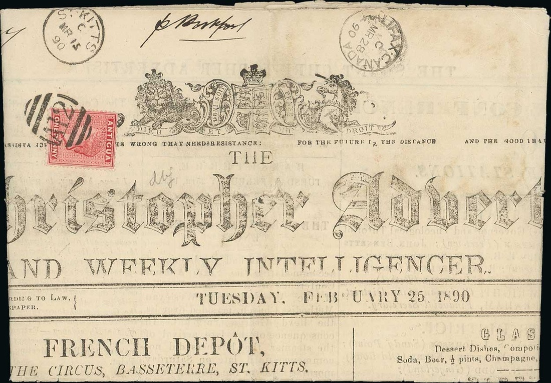 1890 (15 Mar.) virtually complete "St. Christopher Advertiser and Weekly Intelligencer" newspaper for 25th February. bearing 1d. rose clearly tied by fine "A12" obliterator and showing St. Kitts and Halifax, Canada (28.3) datestamps; some splits along folds. Very rare. Photo