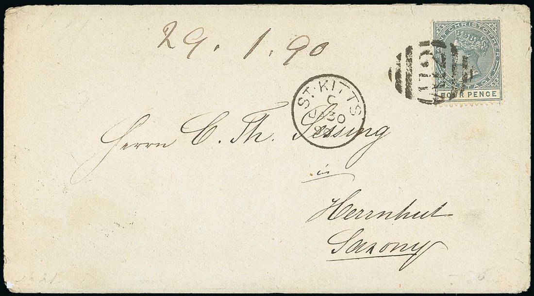 1890 envelope to Germany, bearing 1884 4d. grey tied by "A12" obliterator, showing manuscript "29.1.90" with St. Kitts c.d.s. alongside and clear arrival datestamp (17.2) on reverse; the envelope with split at right. Photo