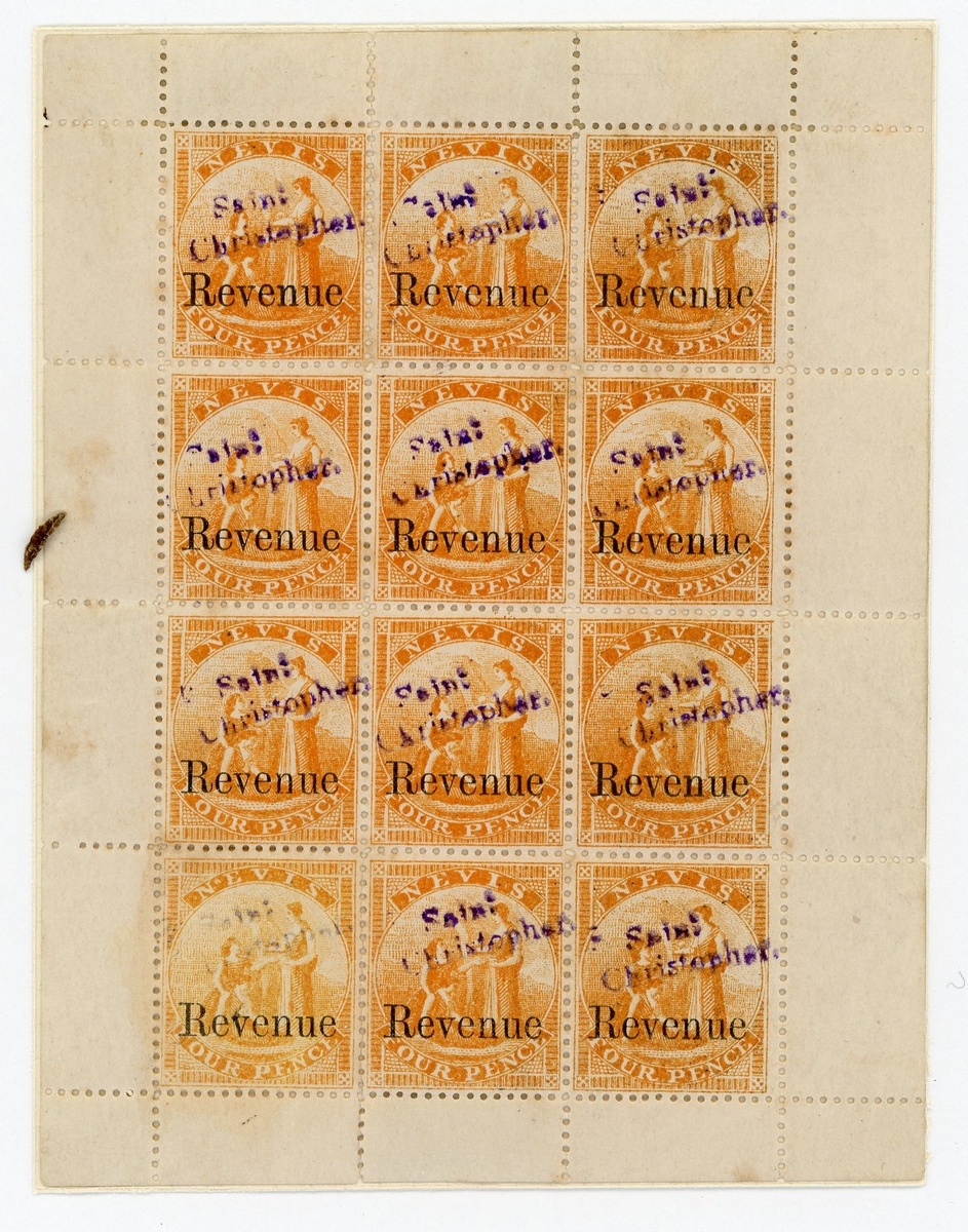 1883 handstamped "Saint/Christopher" in violet on Nevis 4d. orange, a complete sheet of twelve with large part original gum, some split perfs and some tone spots, mainly on reverse; also a mint corner pair, a pen-cancelled single and 1/- green with perfins