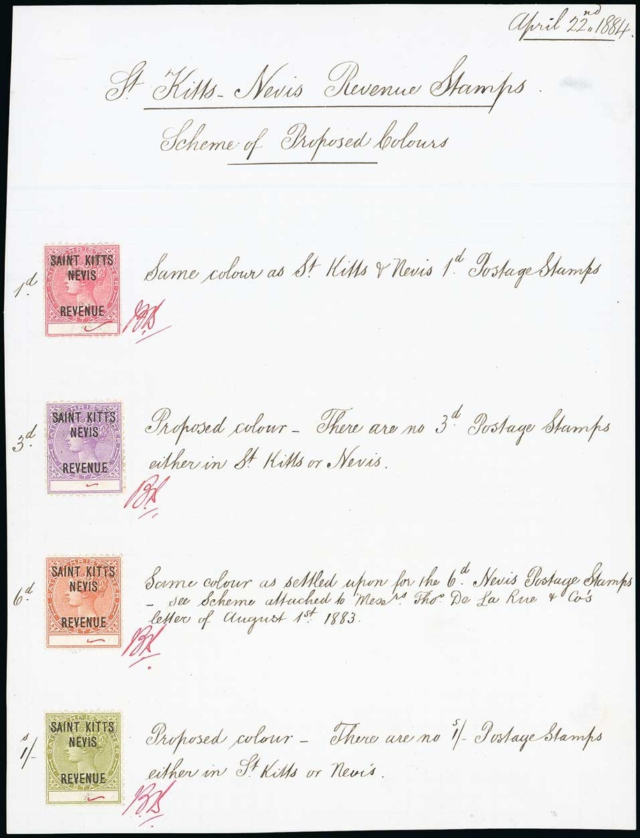 1884 (22 Apr.) piece of paper (160x210mm.) entitled "Scheme of Proposed Colours", bearing Revenue stamps (4) with blank value tablet in rose, in mauve, in orange-brown and in olive with "1d", "3d", "6d" and "1/-" written alongside, each initialled and value tablet ticked, the 1d. marked "Same colour as St Kitts and Nevis 1d Postage Stamp", the 3d. and 1/- "Proposed colour - there are no 3d (or 1/-) Postage Stamps either in St Kitts or Nevis" and the 6d. "Same colour as settled upon for the 6d. Nevis Postage Stamps - see scheme attached to Messers Tho De La Rue & Co's letter of August 1st 1883". Photo