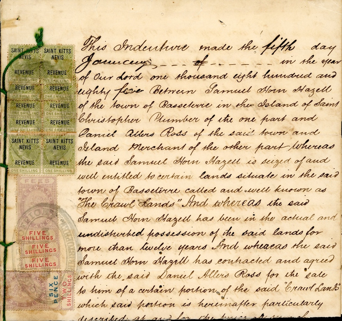 1885 Indenture bearing 1884 1/- (10, most affixed overlapping) in combination with Leeward Islands 1882 6d., 3/- and 5/- (3, affixed overlapping), all cancelled by large