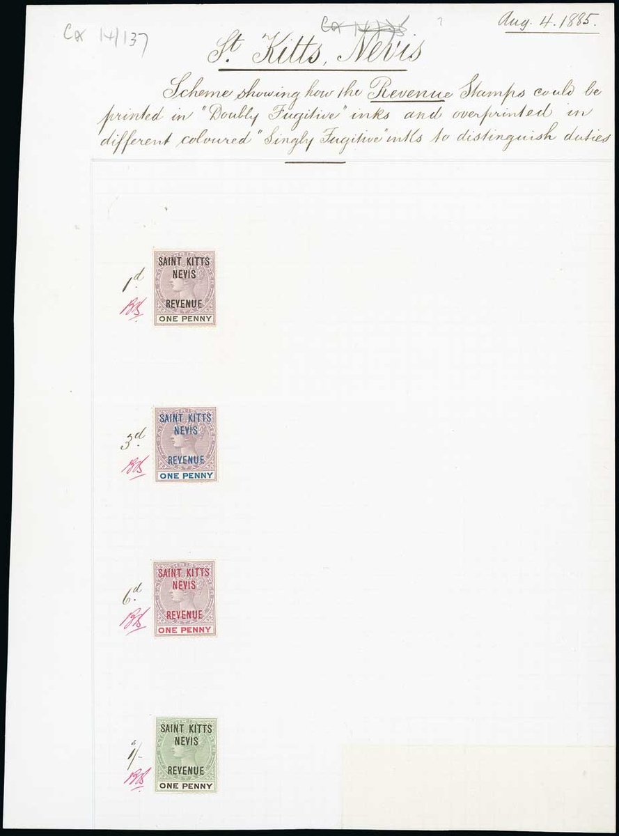 1885 (4 Aug.) sheet (187x255mm.) sheet entitled "Scheme showing how the Revenue Stamps could be printed in "Doubly Fugitive" inks and overprinted in different coloured "Singly Fugitive" inks to distinguish duties". 1d. in mauve and black, overprinted in black; in mauve and blue, overprinted in blue; in mauve and carmine, overprinted in carmine; and in green and black, overprinted in black with "1d", "3d", "6d" and "1/-" written alongside and each initialled in red ink. Photo