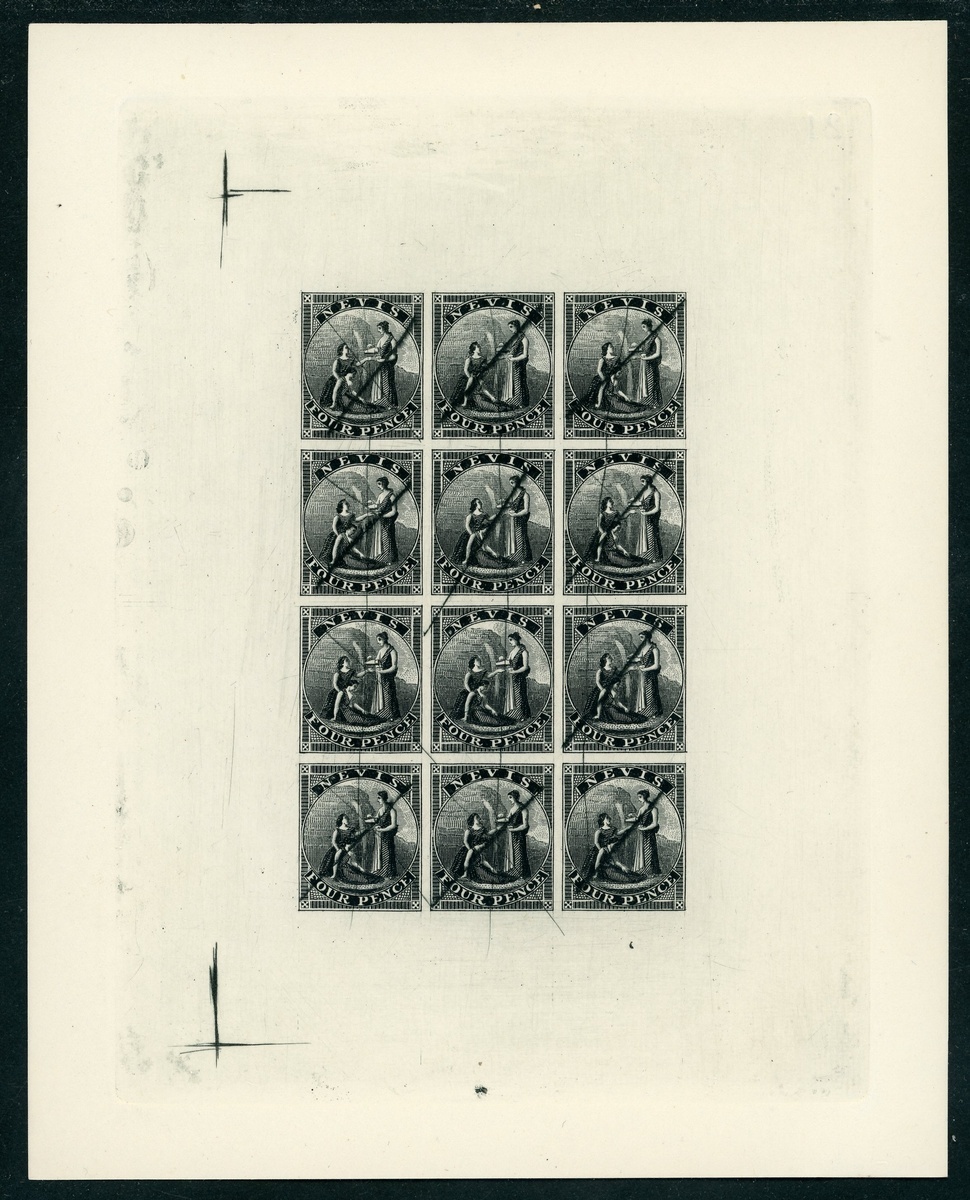 1862 (July) reprinted sheets comprising 1d., 4d. (defaced), 6d. and 1/-, all printed in black in July 1931, plus printed envelope (adhesive tape stain at top) numbered "21" of a series of 50 sets, fineR