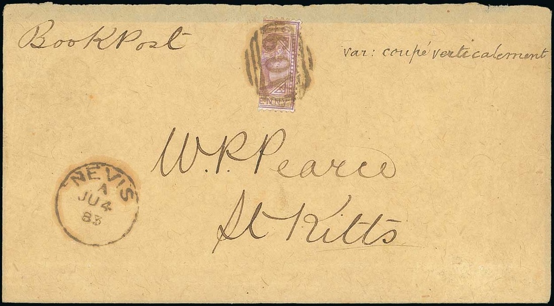 1883 (4 June) envelope (flap missing) to St. Kitts, bearing 1882 1d. lilac-mauve bisected diagonally, neatly tied by "A09" obliterator and showing Nevis despatch c.d.s. S.G. 26a, £700. Photo