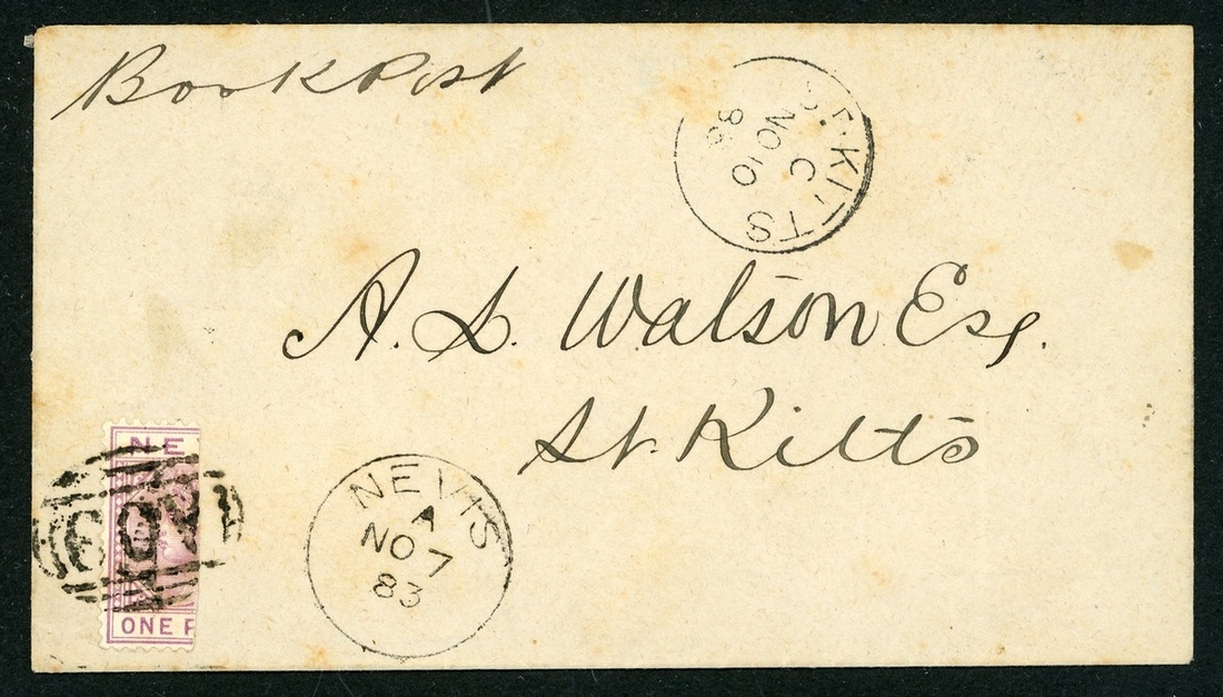 1883 (7 Nov.) envelope to St. Kitts, marked "Book Post", bearing ½d. in black on half of 1d. lilac-mauve, clearly tied by "A09" obliterator and showing despatch and arrival datestamps; the envelope with few light tone spots. S.G. 36