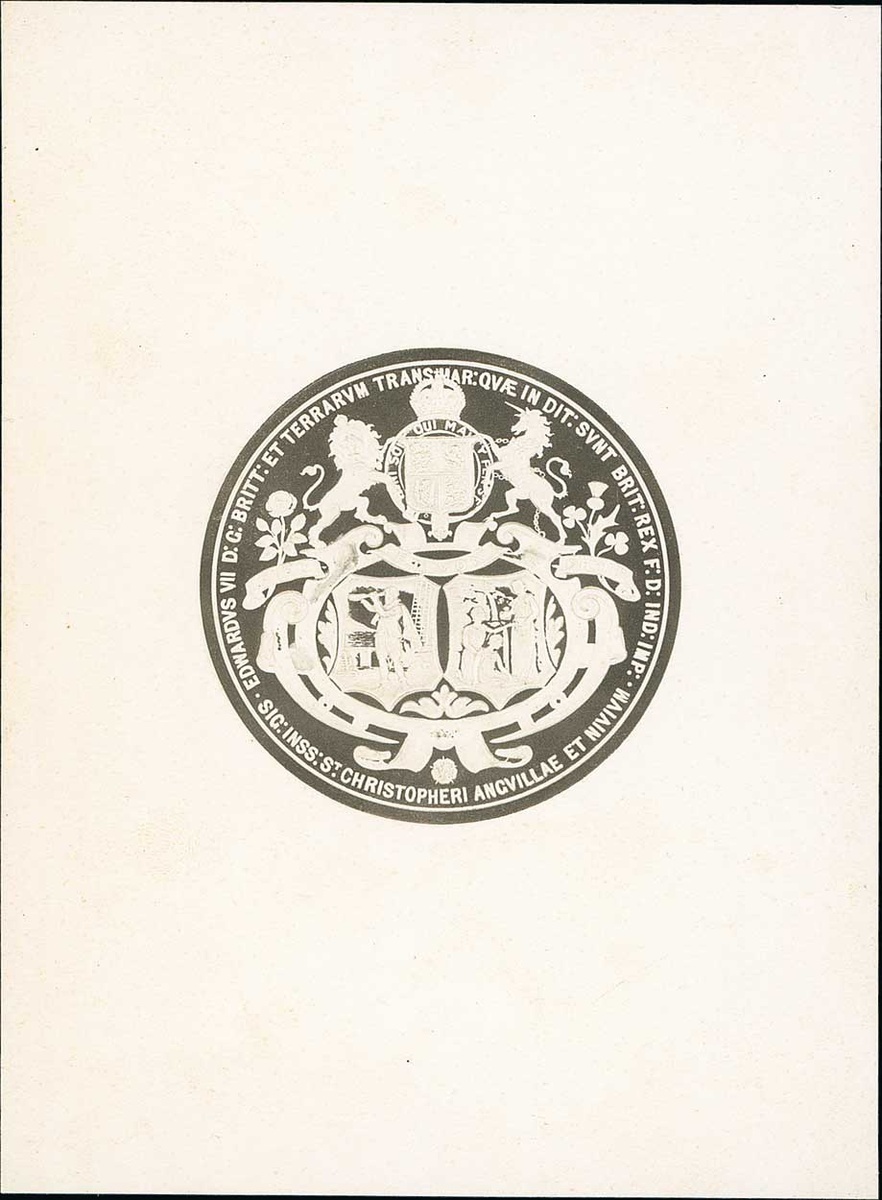 Embossed die proof of the official seal of St. Christopher showing the two designs used for the first issue of St. Kitts-Nevis, in black on card (118x160mm.), fine. Photo