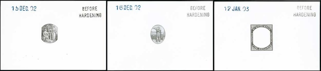 Columbus and Medicinal Spring vignettes, ½d., 1d., 2d., 2½d., 3d., 6d.,1/-, 2/-, 2/6d. and 5/- frames, each in black on glazed card (92x60mm.) marked