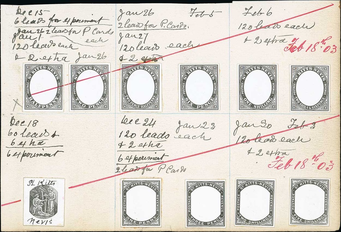 Medicinal Spring vignette, ½d., 1d., 2d., 2½d., 3d., 6d., 1/-, 2/-, 2/6d. and 5/- frames, each stamp-size in black on glazed card and affixed to thin card (171x115mm.) and Columbus vignette affixed to thin card (57x55mm.) giving details of leads taken, dated between "Dec 15" and "Feb 6" and further dated "Feb 18th 03" in red ink with red ink line crossing four proofs, the vignette proofs with manuscript "St Kitts" at top and "Nevis" at foot. Photo