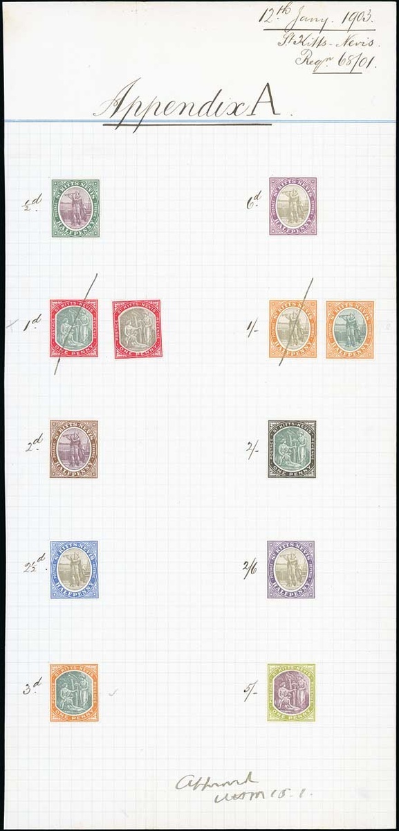 "Appendix A" sheet (167x331mm.) with ½d. Columbus (7) and 1d. Medicinal Spring (5) imperforate colour trials with the suggest values for the ten colours and designs written alongside, the 1d. in dull green and carmine and the 1/- in grey-black and orange have been replaced by two in the accepted colours, the whole marked "Approved WHM 18.1" and dated "12 Jany 1903", a vertical crease passes through the accepted 1d. Photo