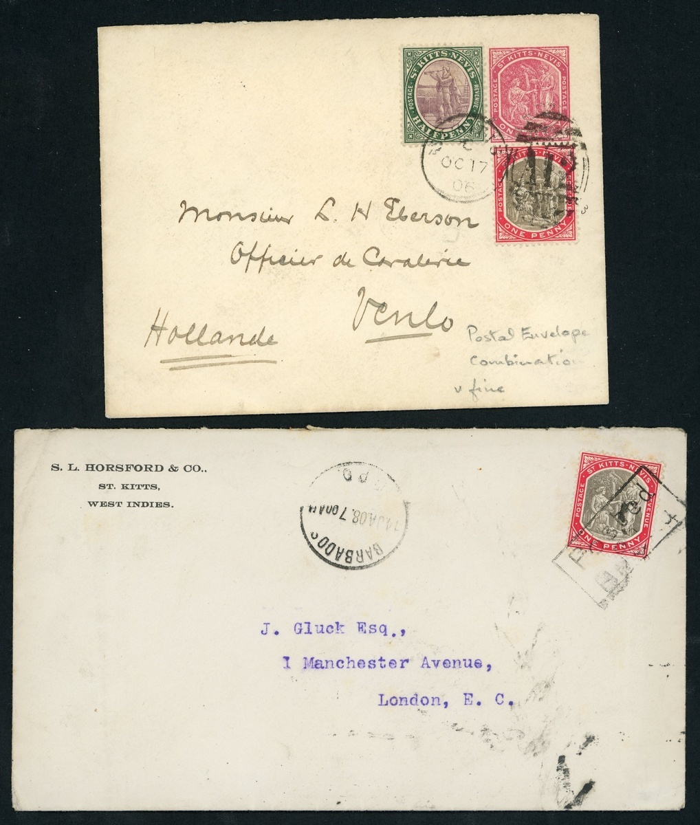 1903-18 envelopes (29, one a 1d. stationery), postcards (12) and pieces (2), variously addressed including to British Guiana and Holland, and showing frankings of ½d. (3), 1d. (25, one a St. Kitts/Leeward Is combination), 1½d., 2d. (2), 2½d. (9) and 5d.; included is 1907 (Dec.) picture postcard from Nevis to Sandy Point showing