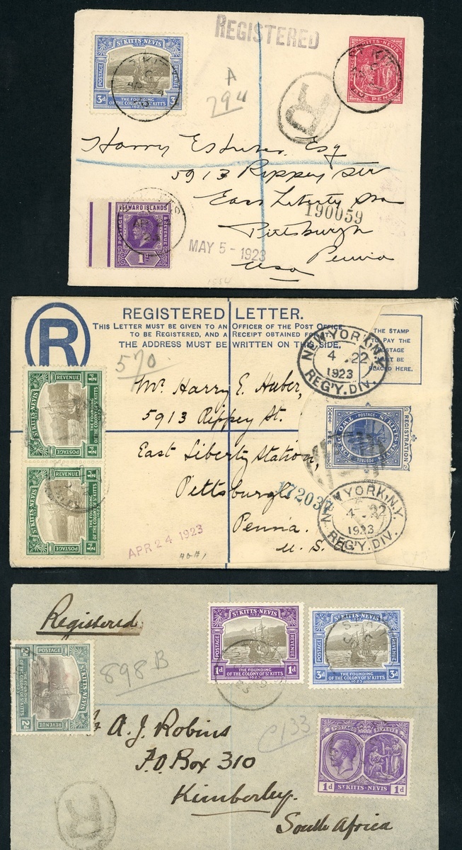 1923-31 envelopes (14) and stationery registered envelopes (3), mostly addressed to UK or USA but including to South Africa, frankings include 5d. (4, two in combination with Leeward Is, one on 1d. stationery envelope), 5½d. (3), 6d. (5, one a stationery registered envelope), 7d., 7½d. (2) and 9½d. (stationery registered envelope); also four 1923 "Wilson" envelopes to Birmingham, two bearing ½d. to 3d. and two bearing 6d. and 1/-. A good lot