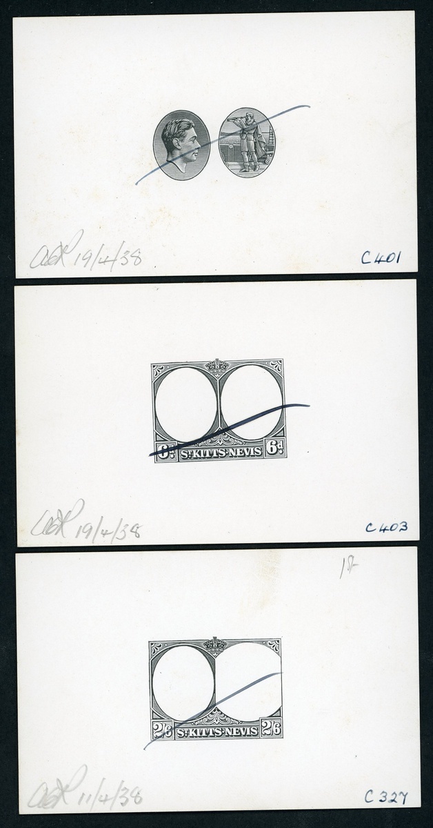 King's Head and Columbus vignette and 6d. and 2/6d. frames, each in black on glazed card (92x60mm.), marked