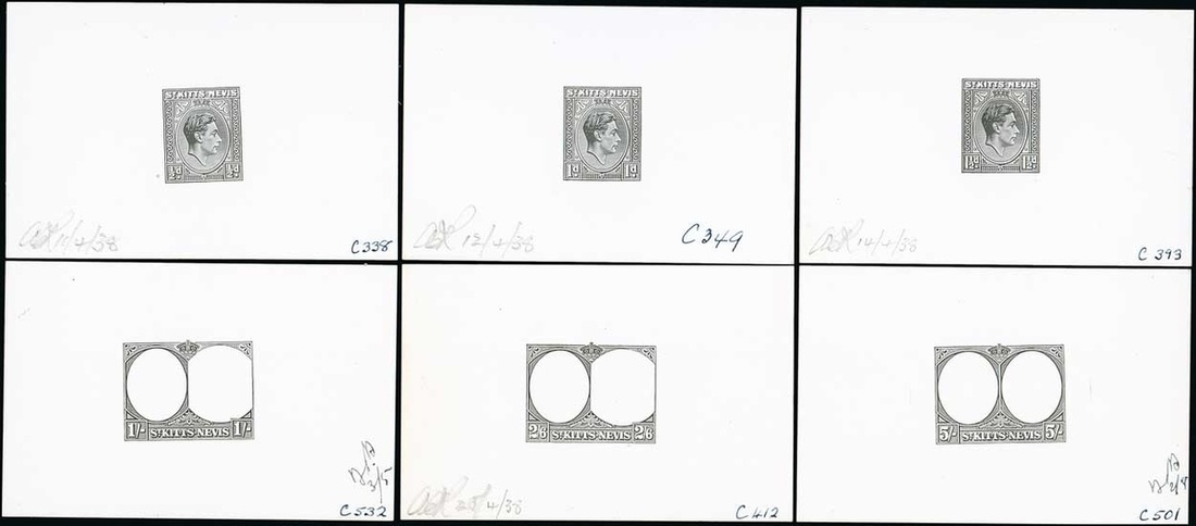 ½d., 1d., 1½d. and 2½d. complete, 2d., 3d. 6d. (2), 1/-, 2/6d. (2) and 5/- frames, all in black on glazed card (92x60mm.), each initialled and dated between "25/2/38" and "25/4/38", fine. Photo