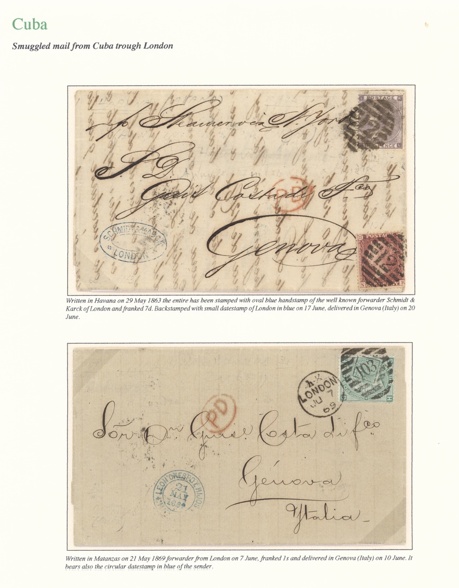 1863-69 three entire letters to the same address in Genoa, Italy, written in Havana or Matanzas, carried privately to London and posted there with Great Britain 6d., 7d. or 1/- frankings (postage from Cuba would have been considerably greater); fine. Also 1842-56, three stampless entire letters from Havana to London.