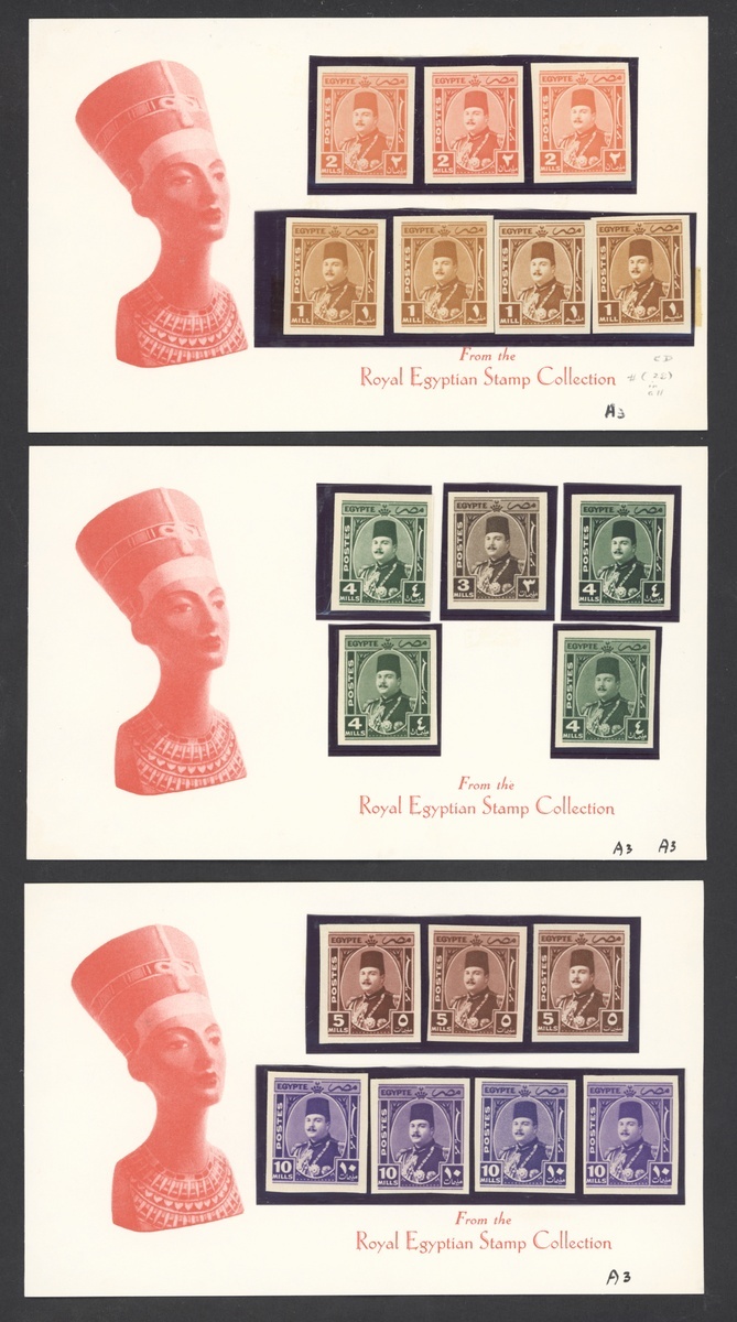 1944-52 King Farouk imperf. 1m. (4 in two shades), 2m. (3), 3m., 4m. (4), 5m. (3), 10m. (4), 15m. (3), 17m. (3), 20m. and 22m. (2), all on card with Cancelled in English or Arabic on reverse, and perforated 1m. (2), 2m., 3m., 4m. (2), 10m. (3 in two shades), 17m. and 20m., mint and with "Royal" cartouche on reverse; fine