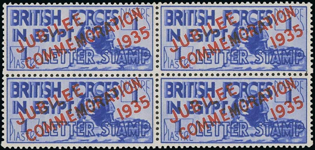 1935 Jubilee 1p. ultramarine block of four, Row 2/4 broken