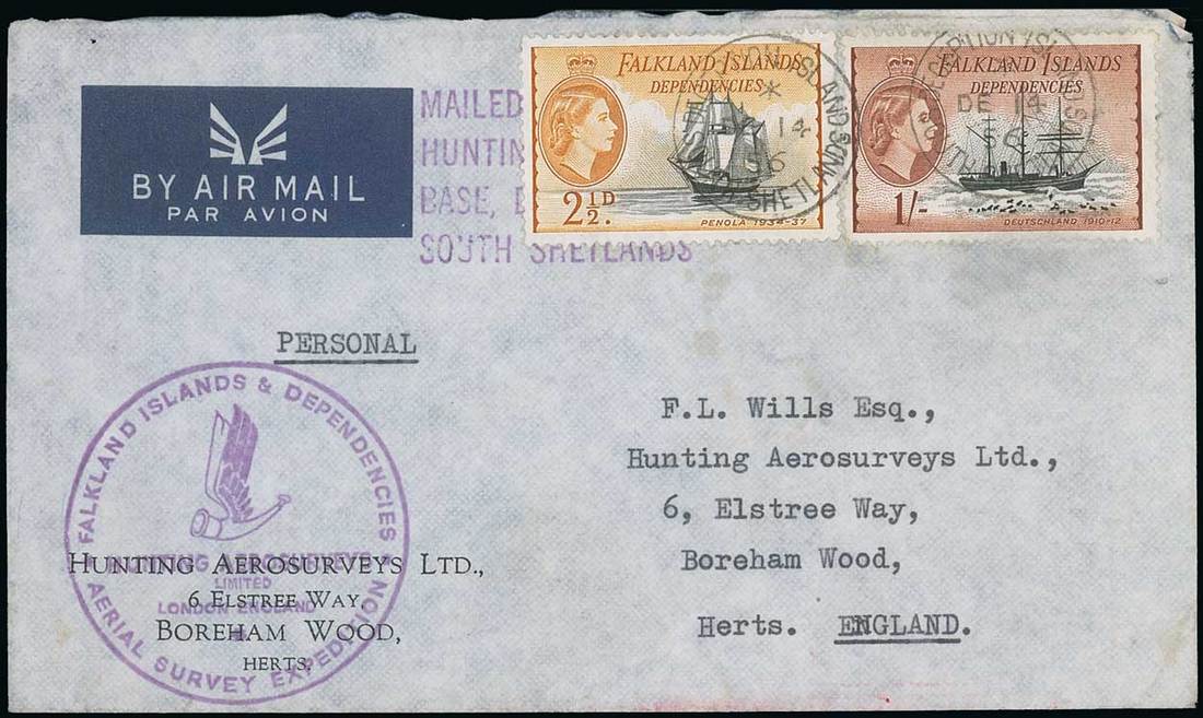 1956 (14 Dec.) air mail envelope to England, bearing 1954-62 2½d., 1/- with Deception Island cancellations and violet