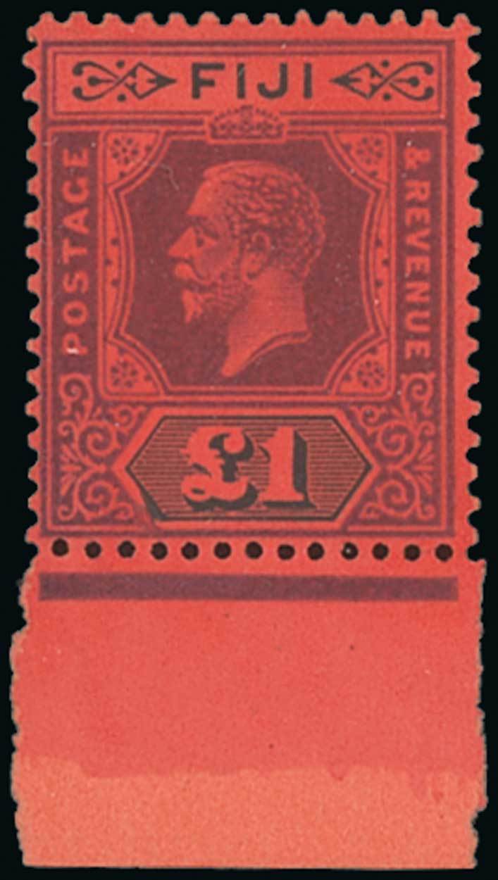 1923 £1 purple and black on red Die II, marginal from the foot of the sheet, unmounted mint with a couple of patches of flatish gum; small printing flaw to lower left corner of the value tablet and adjoining area caused by a pre-printing paper inclusion. S.G. 137a, £250. Photo