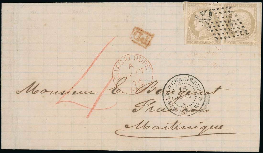 1874 (17 July) entire letter to Martinique, bearing General Issues 1872-77 30c. drab (pair, cut into at right) sharing a single lozenge of dots cancellation, British and French Post Office datestamps on the front and small