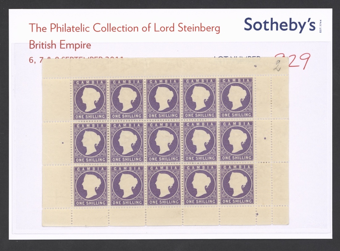 1/- violet complete sheet of fifteen, mint with a couple of mounts in right-hand margin, the stamps remaining unmounted; a few split perforations. S.G. 35