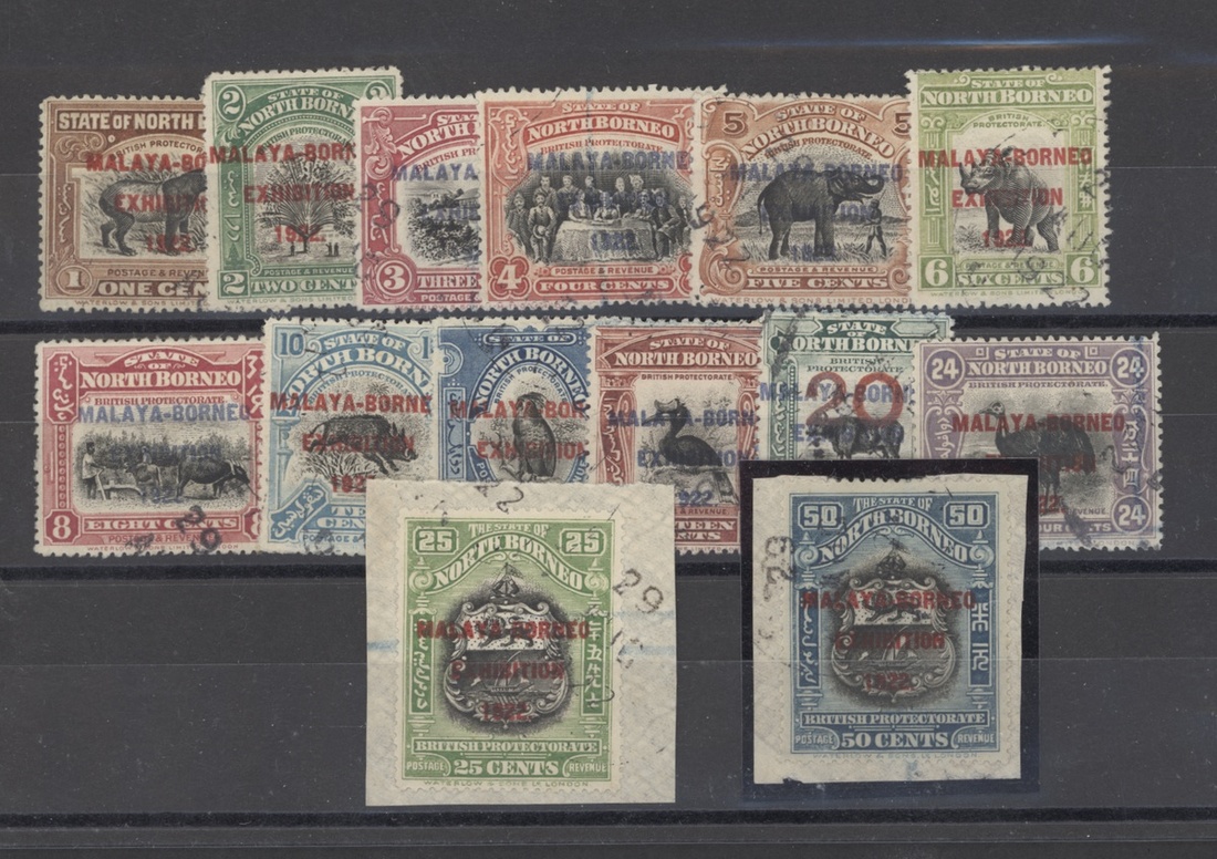 1922 Malaya Borneo Exhibition 1c. to 50c., set of fourteen, fine used, the top two values on small pieces. Difficult to assemble in such fine condition. S.G. 253-275, £800