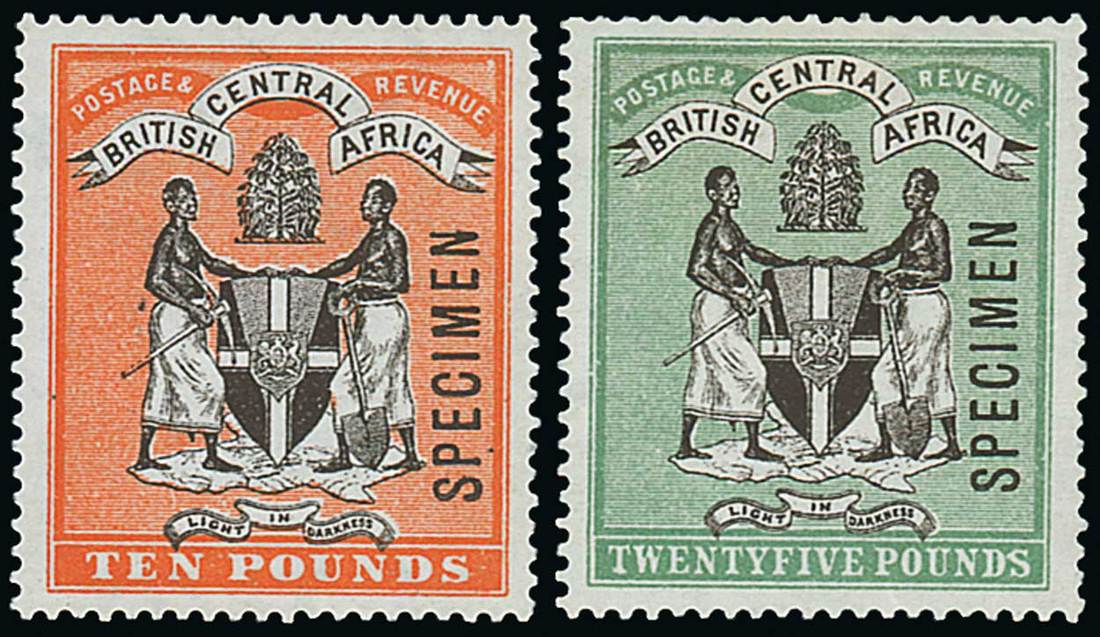 £10 black and orange and £25 black and green, both overprinted "