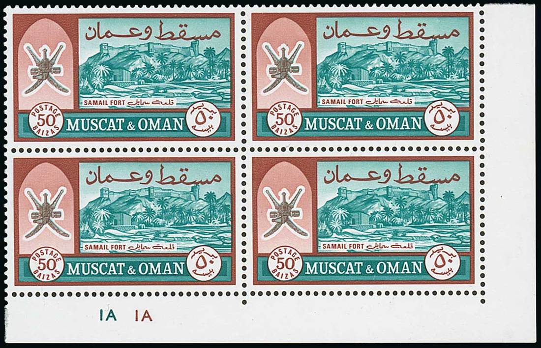 1966-67 50b. blue-green and red-brown type II, a block of four from the lower left corner of the sheet with plate numbers, unmounted mint, fine and rare. S.G. 101a, £1,300+. Photo