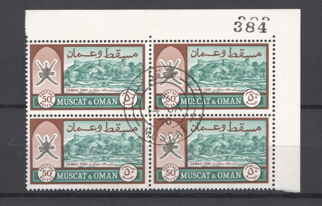 1966-67 50b. blue-green and red-brown, type II, a block of four from the upper right corner of the sheet with current number and central Muscat c.d.s., fine and rare. S.G. 101a