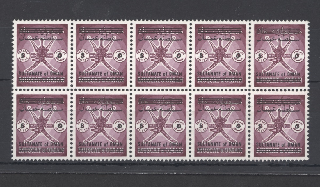 1971 5b. on 3b. reddish purple, unmounted mint block of ten (5x2), folded through one row of vertical perfs., fine. S.G. 138, £1,600+