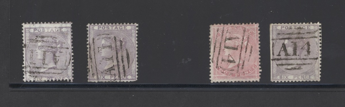 1858-60 6d. (2) with clear "A11" barred oval cancellations, also Tobago 1858-60 4d. and 6d. (straight edge at left) with "A14" barred oval cancellations; a few small faults but fine appearance