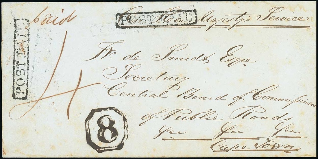 No. 8 (Simonstown): Undated Official entire (some minor staining) to Cape Town, rated "4", showing very fine "8" in Octagon and two strikes of framed