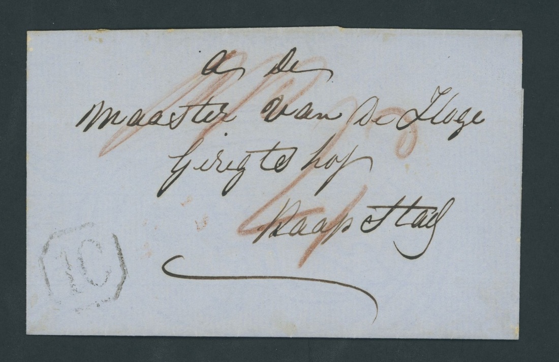 No. 10 (Stellenbosch): Undated entire to Cape Town, rated "4d" in red crayon and showing a light strike of "10" in Octagon