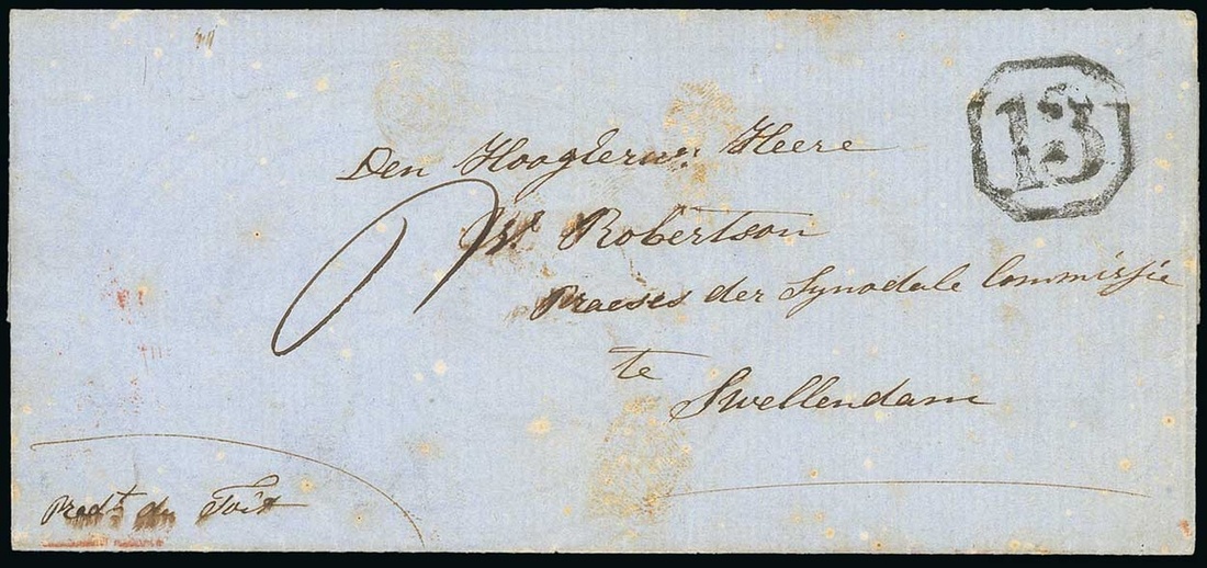 No. 13 (Wellington): 1853 (Dec.) entire (light stains in places) to Swellendam, rated "6", showing fine "13" in Octagon with, on reverse, despatch and Cape Town datestamps in red. Very scarce. Photo