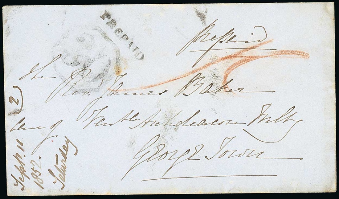 No. 30 (Swellendam): 1852 envelope to George Town, showing red crayon "4", light strike of "30" in Octagon with Postmaster's
