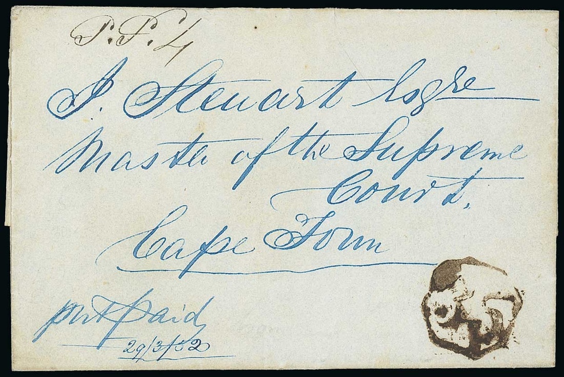 No. 35 (Lange Kloof): Undated entire to Cape Town, marked "P.P.4d", showing a good to fine though over-inked strike of "35" in Octagon. Rare. Photo